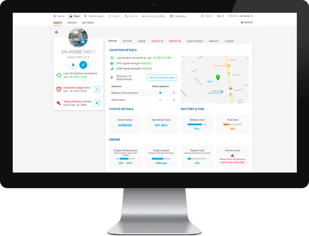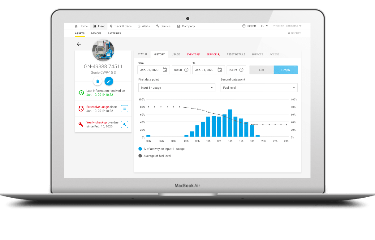 Gem One vous permet de personnaliser votre appareil télématique en fonction de vos besoins. Vous pouvez visualiser votre équipement, l'opérateur, à quel moment est prévue la maintenance, etc, ainsi que bénéficier de données en temps réel pour obtenir des statistiques précises.